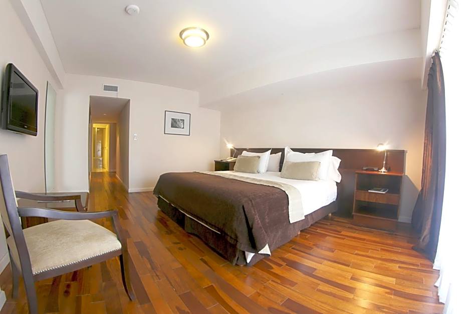 This suite features 2 separate areas, a living and bedroom, equipped with a king-size bed, LCD TV, individually controlled air conditioning and heating with remote control, safety box with electronic lock (laptop capacity), and free Wi-Fi. The living area has a 3 seat sofa, 2 individual armchairs, a coffee table, a work desk for 4 people, a bathroom in 2 areas with a hydromassage tub, soundproofed windows, a balcony and a terrace.